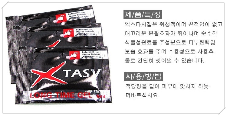 엑스타시 (Xtasy) 롱타임 사정지연 젤은 관계 전에 남성의 성기에 바르면 민감도를 떨어트려 관계 시간을 증가 시켜주는 러브젤이다. 특히 평소에 조루증에 대한 스트레스가 있거나, 컨디션이 안 좋은 날 조기 사정에 대한 걱정이 될 때 손쉽게 쓸 수 있는 제품이다.